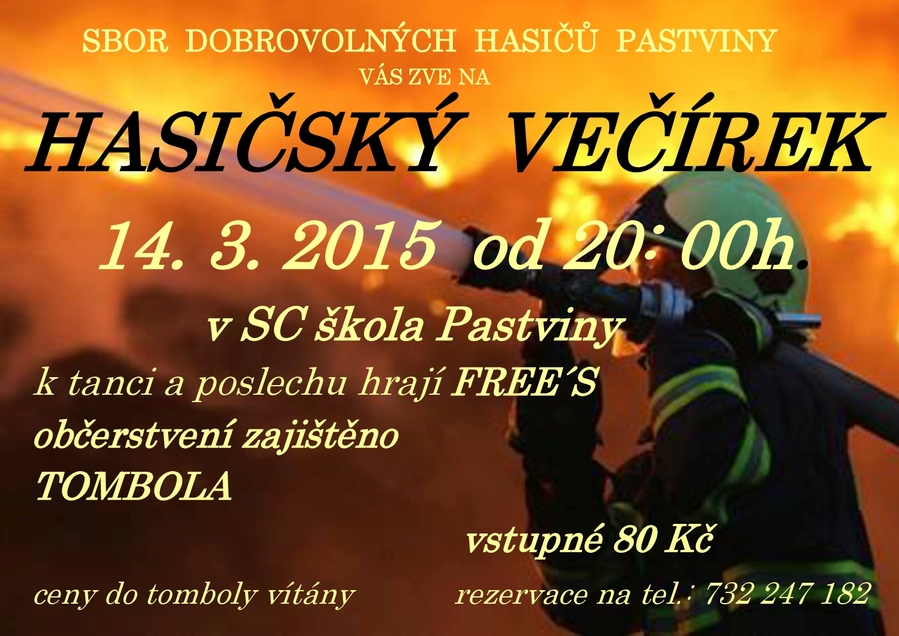 Plakát - hasičský plesPOZOR plesová sezóna vrcholí a Spolek dobrovolných hasičů - Pastviny si Vás dovolují pozvat na další skvělou společenskou akci! Letos po několikaleté prodlevě se opět uskuteční tradiční HASIČSKÝ VEČÍREK a to v sobotu 14.03.2015 ve Společenském centru ŠKOLA. Zahájení akce od 20:00 hodin. Bohatá tombola, skvělá obsluha a k tanci Vám celý večer bude hrát kapel FREES. Těšíme se na Vaši návštěvu a hořet Vám snad bude jen taneční obuv.