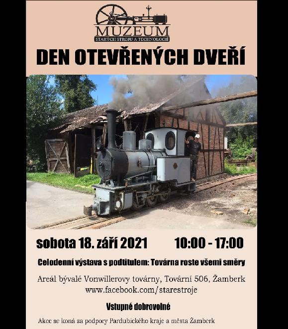18.9.2021 od 10.00 do 17.00 bude v Muzeu starých strojů a technologií v Žamberku den otevřených dveří. Na akci je možno přijet z České Třebové parním vlakem a z Litomyšle vlakem motorovým.