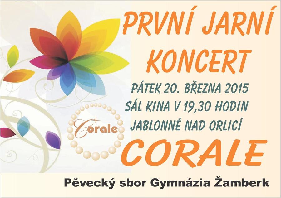 CoralePěvecký sbor Gymnázia v Žamberku jistě není třeba dalece představovat. Jejich vystoupení je vždy zárukou pěkného hudebního zážitku. Tentokrát se v Jablonném nad Orlicí představí u příležitosti nového CD s názvem „Splněná přání“, které bylo v roce 2014 natočeno v ZUŠ Jaroslava Kociana v Ústí nad Orlicí. Koncert se uskuteční v sále kina v Jablonném nad Orlicí