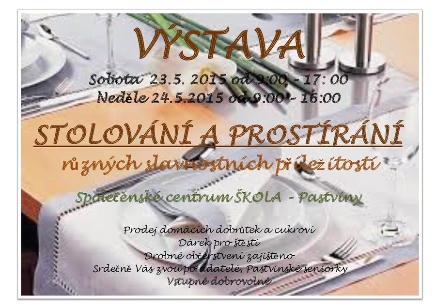 PozvánkaPastvinské seniorky ve spolupráci s obcí Pastviny si Vás dovoluji srdečně pozvat na výstavu STOLOVÁNÍ a PROSTÍRÁNÍ k nejrůznějším slavnostním příležitostem. Výstava se koná ve Společenském centru škola - Pastviny ve dnech 23. - 24.05.2015, v sobotu od 9 - 17 hodin, v neděli od 9 - 16 hodin. Součástí výstavy je prodej nejrůznějších domácích dobrůtek, cukroví a dárečků pro štěstí.