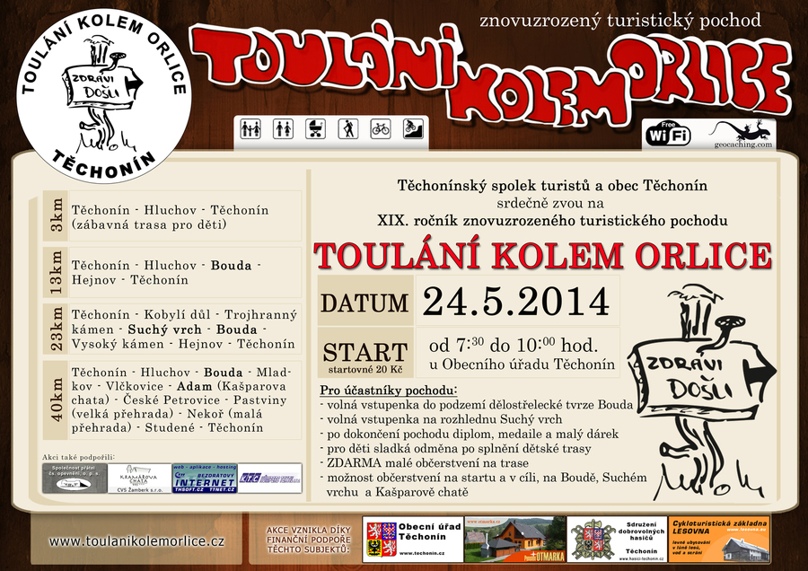 Tradiční pochod Toulání kolem Orlice je opět tu! V sobotu 24.5.2014 si vezměte dobré boty, cyklisté navíc kolo a všichni do jednoho fajn náladu a vydejte se toulat do Těchonína, kde je pro Vás připraven již XIX. ročník pochodu se čtyřmi trasami - 3, 13, 23 a 40 km.